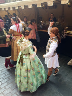 Otra tradición hermosa con la que uno se tropieza estos días son los muchos pasacalles que se ven, con banda de música y mujeres y hombres de todas las edades, incluso con guaguas en coche, vestidos de falleros, que caminan y bailan al ritmo por todos los barrios.
